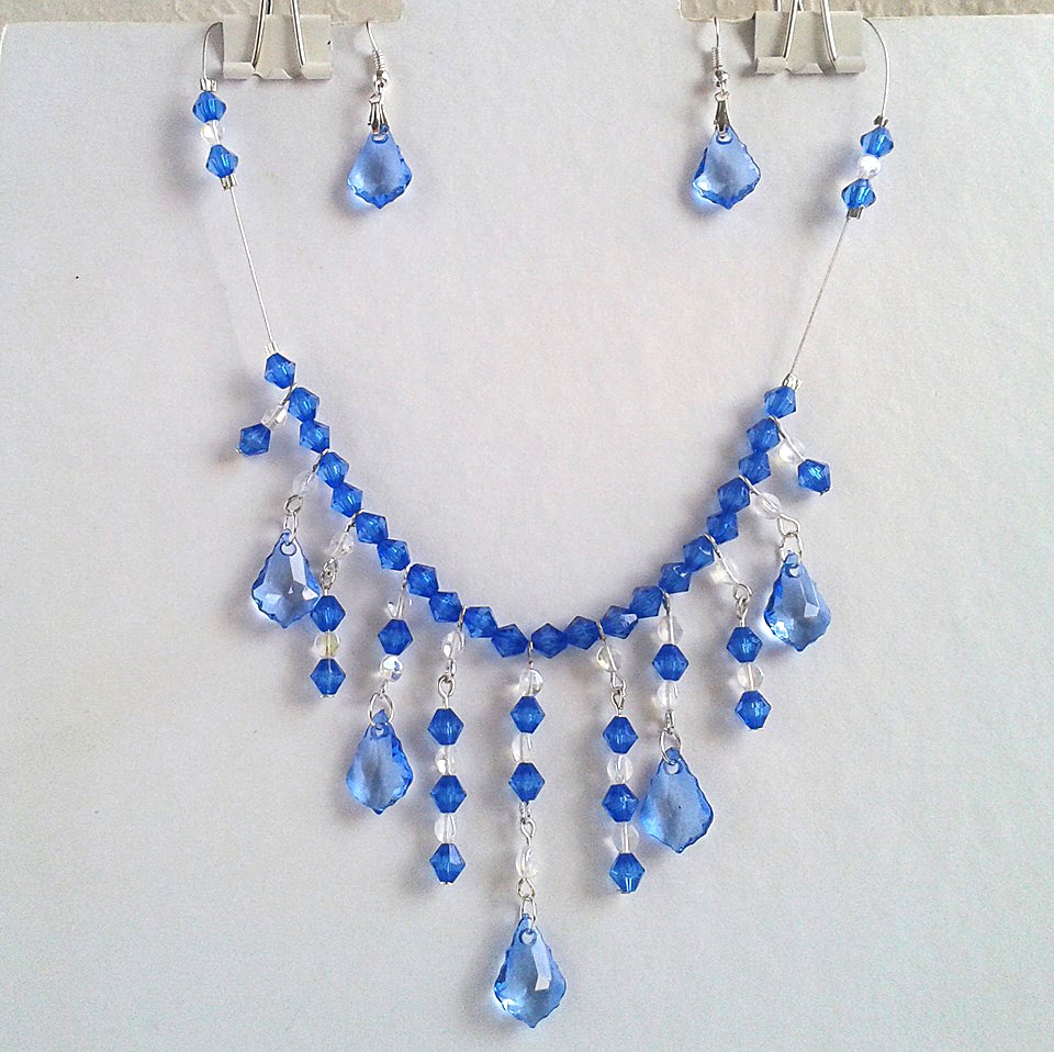 Náhrdelník je vyroben z bižuterního šedého lanka, bižuterních stříbrných komponentů, tmavě modrých sluníček, broušených, plastových korálků ve tvaru baroka (nejedná se o Swarovski), transparentních, skleněných korálků pohankového tvaru a karabinky stříbrné barvy.