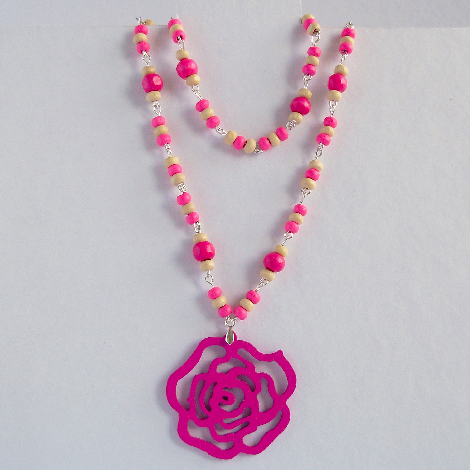 MATERIÁL A DRUH KORÁLKŮ: dřevěné korálky, lanko, biž. komponenty, filigránový přívěsek