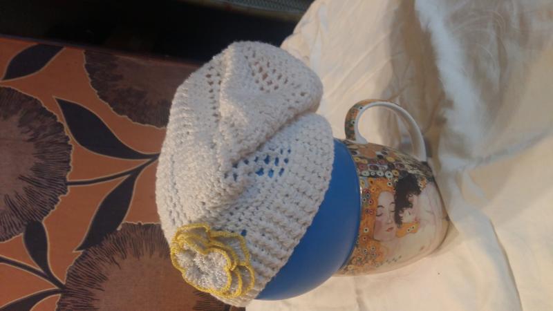 Lehčí čepice ve stylu "houmles" zdobená háčkovaným květem. Vyrobeno ze směsové příze – bavlna, akryl