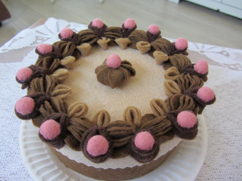Ručně šité plstěné zákusky určené k dekoraci, nebo k hrám pro větší děti. Vzhledem k materiálu a malým částem není vhodné pro děti do 3 let. Velikost dortíku je 12cm průměr, výška 5 cm.