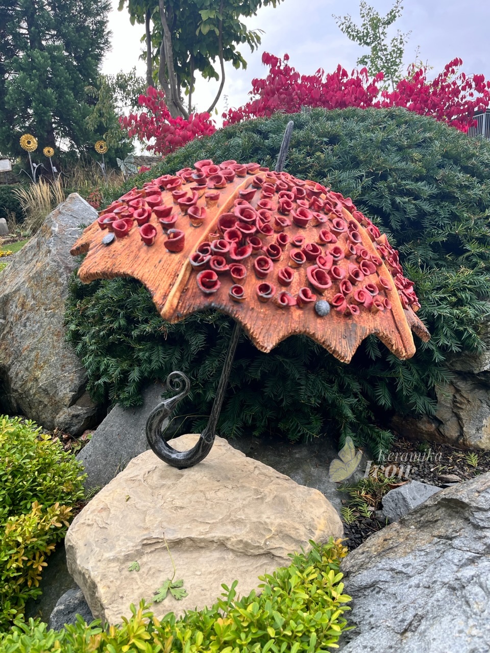 <p>Zahradní dekorace – Deštník s květinovým dekorem. <br />