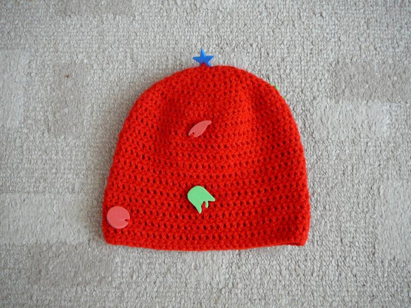 Háčkovaná čepička, obvod cca 34 cm, výška cca 16 cm, uháčkováno ze zahraniční příze s efektními ozdobami.