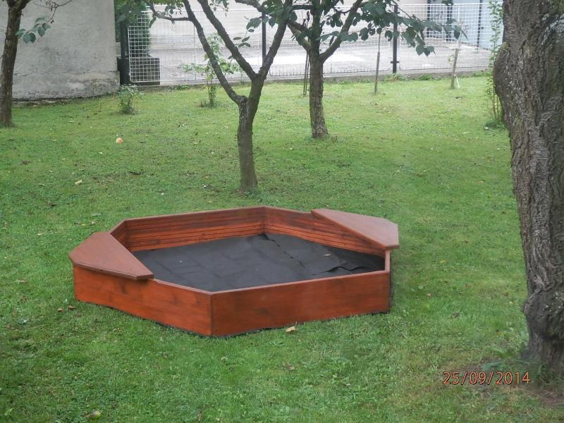 Rozměrné dřevěné pískoviště o průměru 170 cm. Délka jedné strany je 1 m, síla dřeva 28 mm, výška 22 cm.