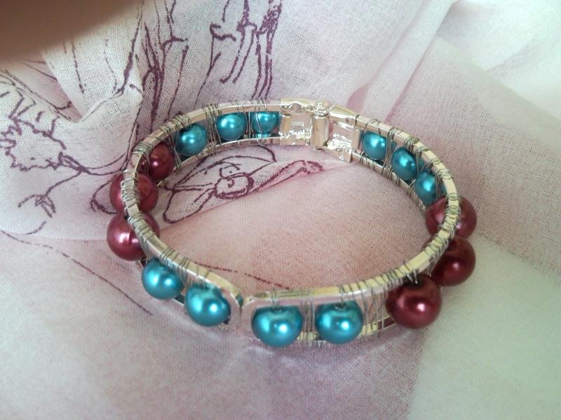 Náramek drátkovaný z perliček v barvě tyrkysové a vínové. Obvod náramku je 19 cm. V dolní části ruky je opatřen pantem. Nádherný doplněk pro každý den.