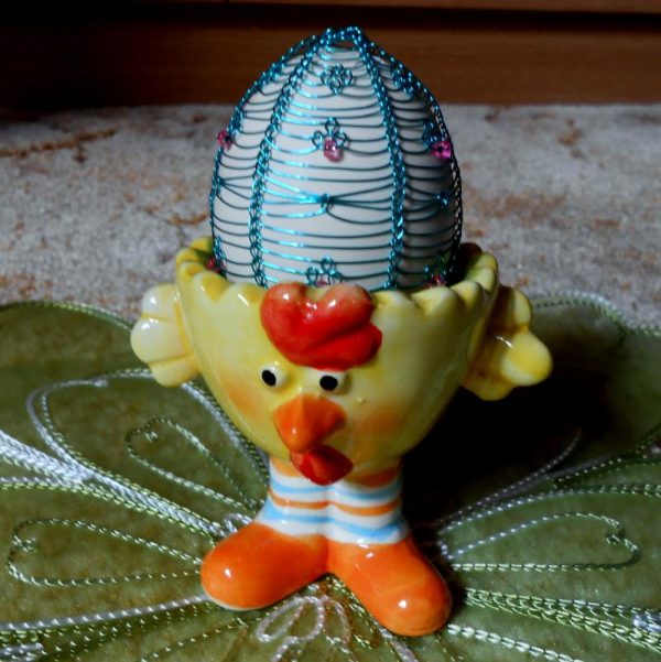 Toto konkrétní vajíčko je velikosti slepičí, je plastové, čili nerozbitné, barvy bílé, dekorované lakovaným drátkem světle modré barvy a růžovými korálky, které se na slunci krásně třpytí.