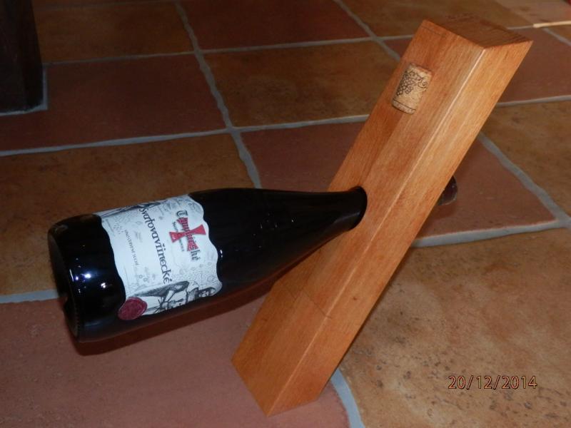 Dřevěný stojan na víno samostatně stojící díky těžišti láhve s vínem.