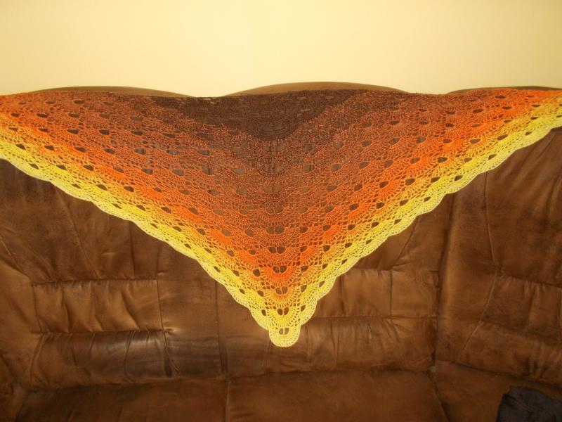 Prodám s láskou tvořený, elegantní, háčkovaný šátek z duhového klubíčka hřejivých barev. Délka 175 cm, šířka 82 cm.