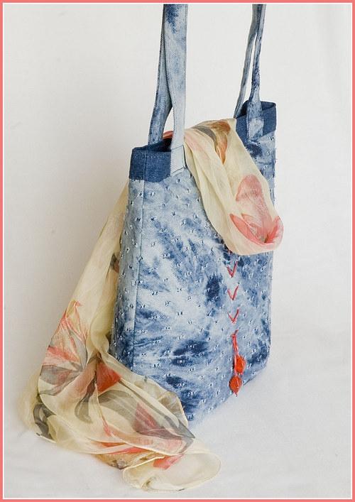 Elegantní kabelka vyrobená z žíhané džínoviny s drobnými dirkami v textuře. Na přední straně je zdobená provlečenou hedvábnou ručně barvenou šňůrkou a mačkanými korálky červené barvy. Velká je 32x28cm.