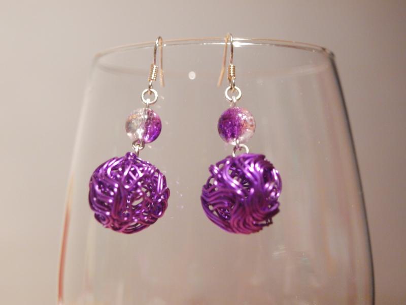 Ketlované naušnice fialové barvy s mačkanými korálkami a drátkovou motanicí.Průměr motanice je 1,7cm.Celková délka včetně zapínání je 4 cm.