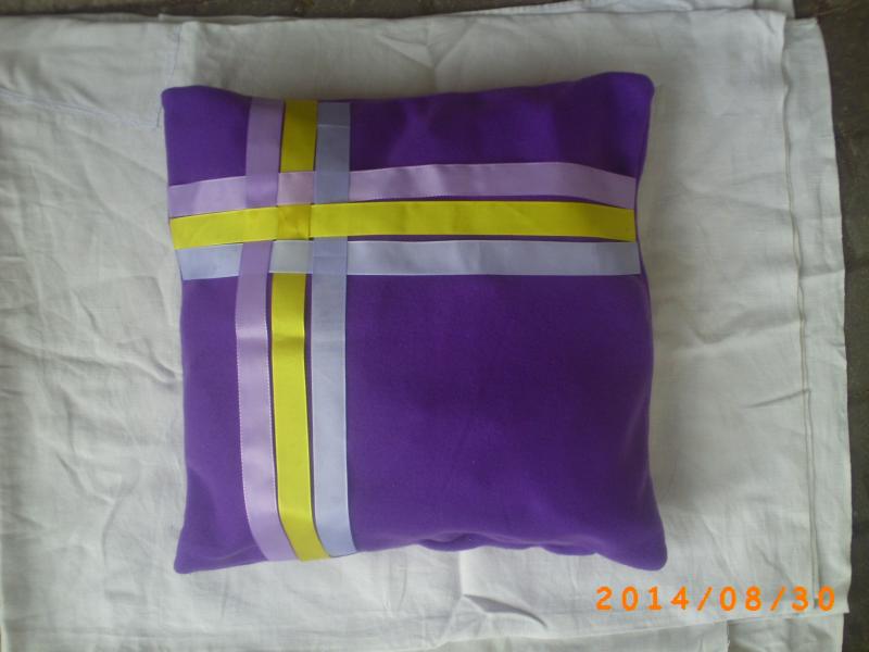 Polštářek barvy fialové, připomínajcí jarní drobnou kytičku fialku.Je ušit z příjemného materialu na předním díle zdoben protkanými mašlemi,naplněný kuličkami z dutého vlákna.Polštářek vhodný jak dekorace do obýváku,dětského pokoje nebo jako mazel do postele.Je možnost použít jen tak pro radost nebo jako dárek.