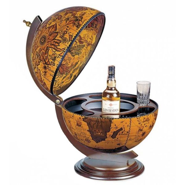 Globusový bar otevírací, spodní polokoule je pevná. Barva Classic hnědá. Bar je určen k postavení na nábytek.