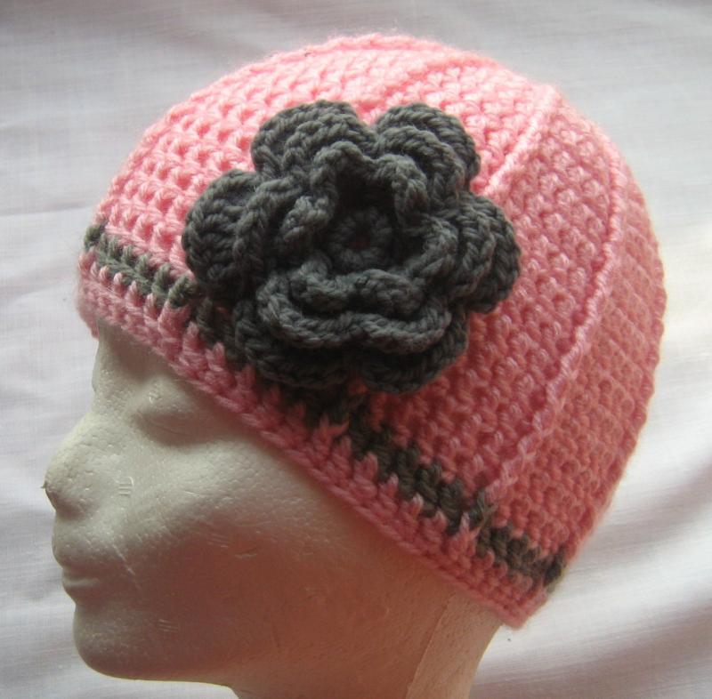 Pěkná kombinace růžové a šedé. Háčkovaná růžová čepka s šedou kytičkou. Obvod 54 cm, výška 20 cm. Na přání uháčkuji jinou velikost i barvu.