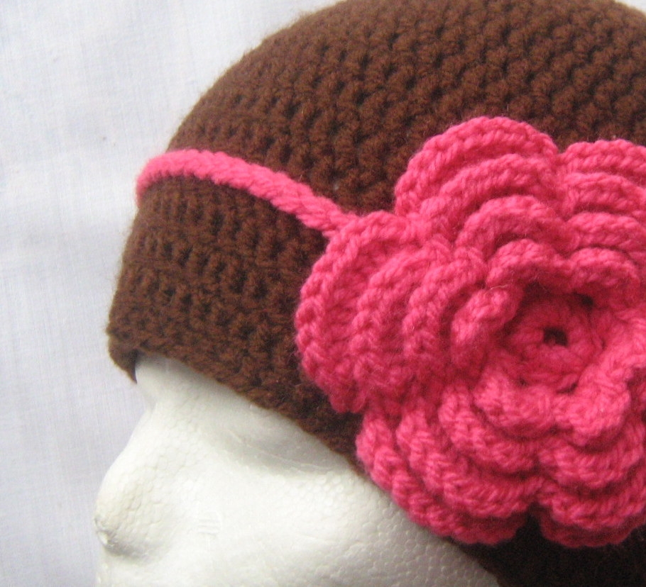 Pěkná kombinace čokoládově hnědé a růžové. Háčkovaná čepka s kytičkou. Obvod 54 cm, výška 20 cm. Na přání uháčkuji jinou velikost i barvu.
