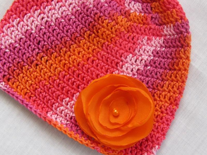Háčkovaná čepka ze 100% bavlny s aplikací kytičkou z organzy.