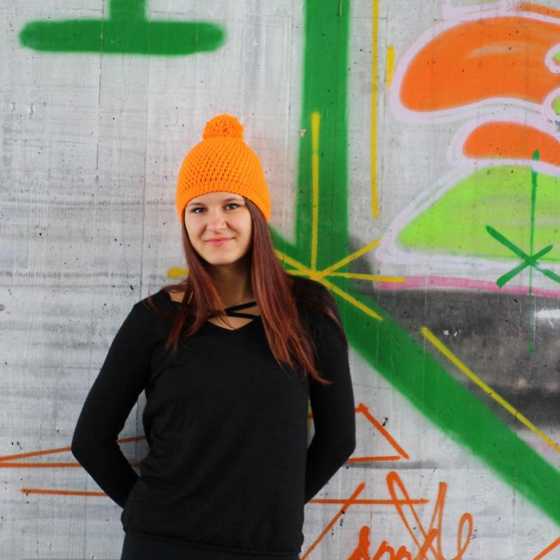 Háčkovaná čepka v zářivé oranžové, nepřehlédnutelná.