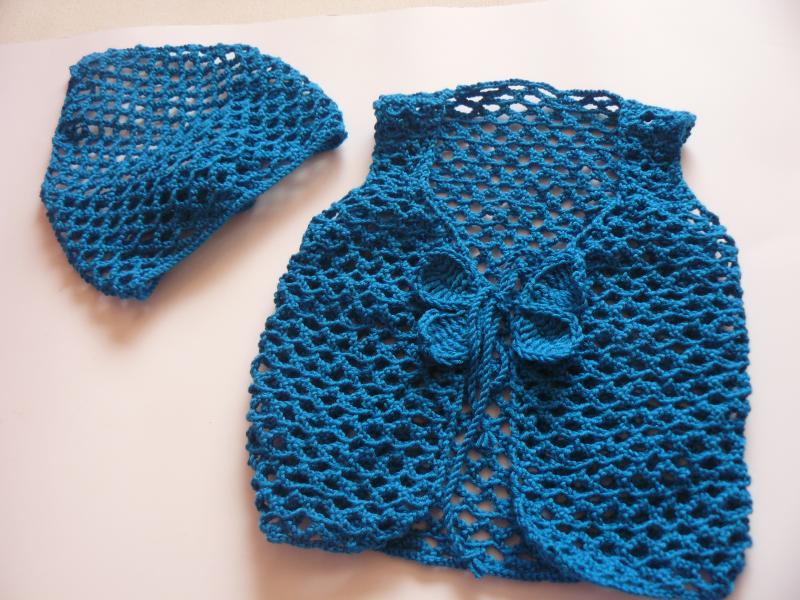 Vestička je háčkovaná z merino vlny dírkovaným vzorem, vpředu na zavazování,ozdobeno lístečky. Součástí je šátek.