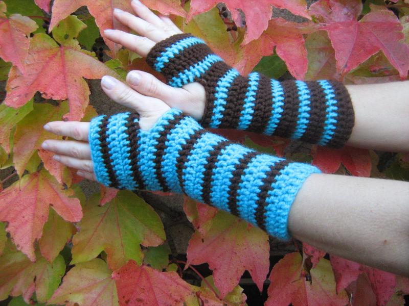 Po ránu je chladno a proto potřebujete parádní háčkované rukavice- návleky. Krásná kombinace tyrkysové a čokoládově hnědé. Jen Vy si můžete vybrat, které barvy má být víc. Délka 23 cm, obvod 20-21cm. Na přání i jiná velikost ev. barevná kombinace.