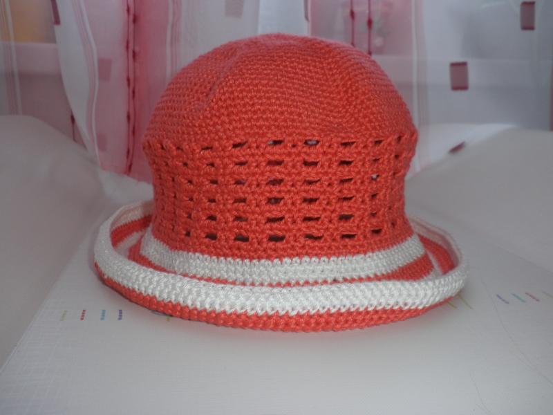 Háčkovaný jarní klobouček v červeno-bílé kombinaci. Ihned k dodání ve velikosti o obvodu hlavičky 47 cm.