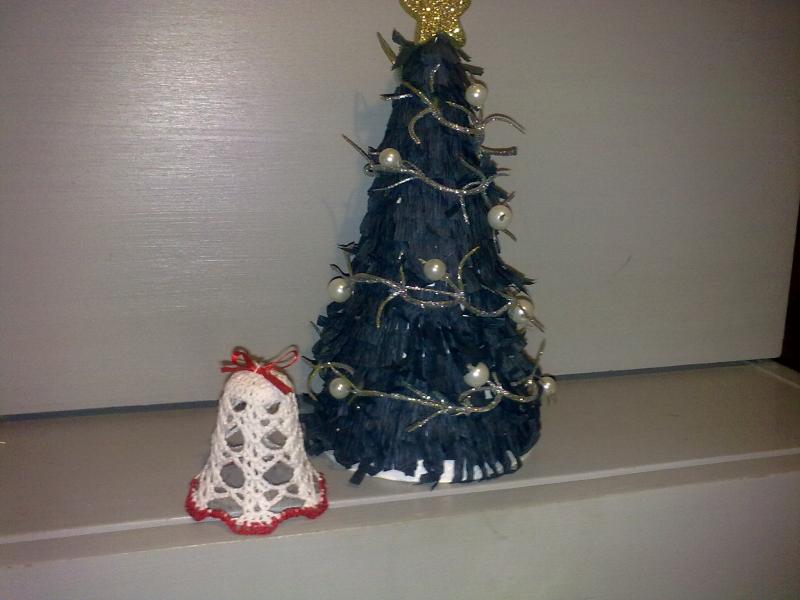 Háčkovaný zvoneček je vysoký 7cm škrobený aby držel tvar a se šňůrkou k zavěšení. Z bílé příze Sněhurka obháčkovaný barevnou přízí (možnost volby barvy na přání zákazníka )