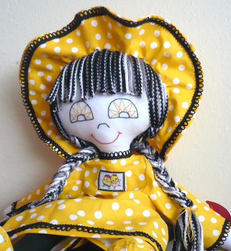 Agáta je klasická hadrová panenka vhodná pro malé děti. Je plněná dutým vláknem, tělo, šaty a klobouk jsou šity z bavlny, na vlasy je použita pletací příze, obličej panenky je vyšitý.