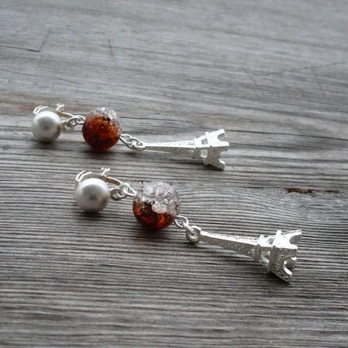 Jednoduché krátké klipsové náušnice (není potřeba mít propíchnutá ouška) jsou tvořeny horním hnědočirým korálkem s ozdobným efektem vnitřní rádoby popraskané struktury a spodním přívěskem stříbrné barvy v podobě Eiffelovy věže.
