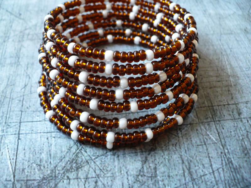 Náramek je vyroben z kvalitního českého rokailu zn. Preciosa, barvy hnědé průhledné s průtahem a perleťové bílé, navlečeném na paměťovém drátu. Délka 8 otoček, průměr 6 cm, šířka 4 cm.
