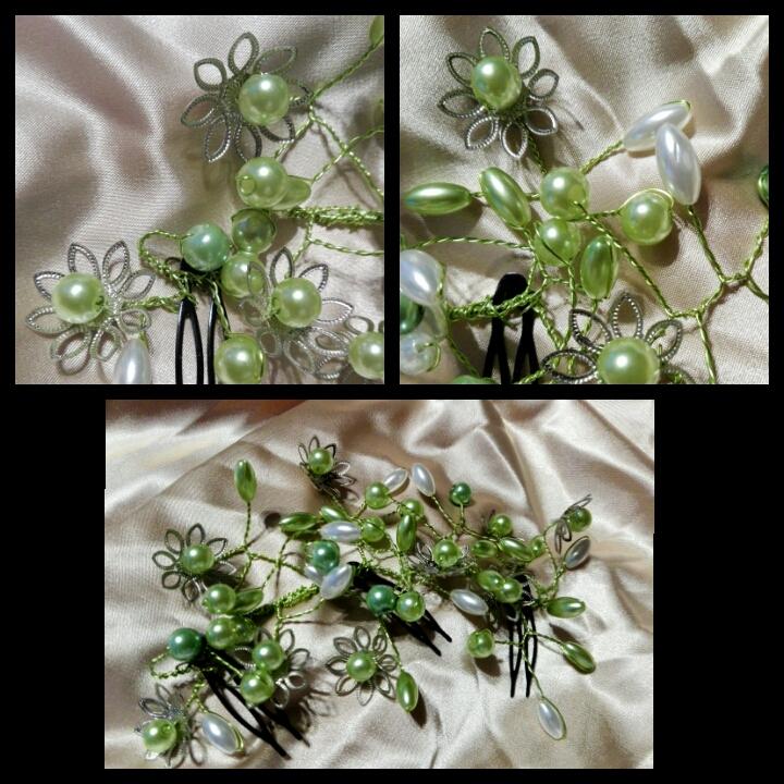 Ručně vyráběný hřeben do vlasů z koralků a drátku.