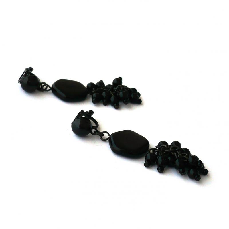 Hrozínek z dvou druhů černých skleněných korálků je zavěšený na větším plochém skleněném korálku s nepravidelnými okraji.