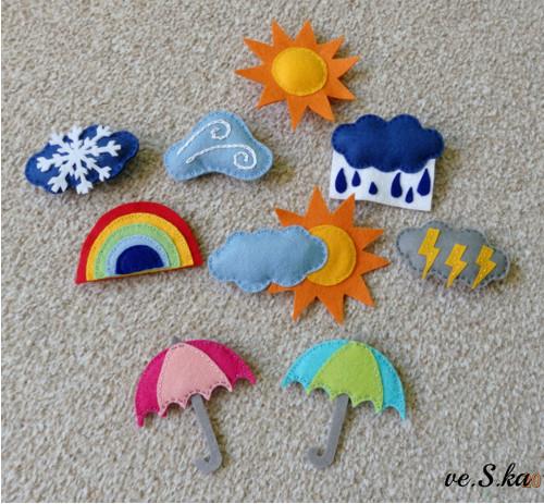 Didaktická, interaktivní i dekorativní hra pro děti je sada devíti kusů, vyrobených z filcu, dodekorovaná vyšívacími bavlnkami, na zadní straně na suchý zip nebo magnet