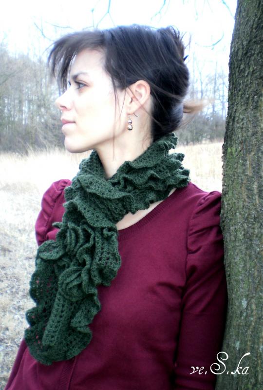 Tmavě zelená šálka je ze 100% akrylu, má volánkové okraje a na jednom konci 3 různě velké květy.