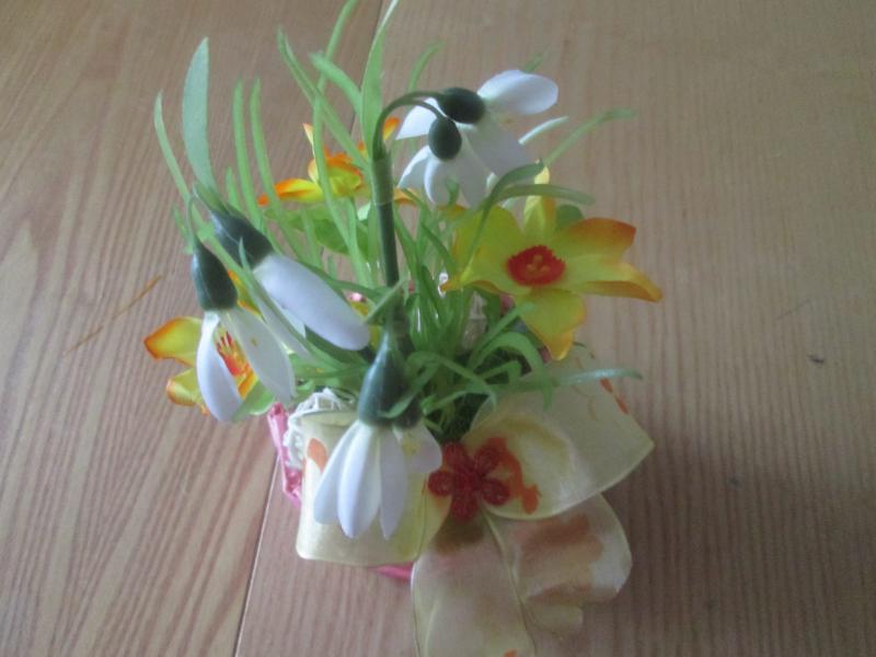 V květináčku z papírového pedigu jsou naaranžovány umělé květiny, které nikdy nezvadnou. Krásný dárek. Výška cca 23 cm, průměr cca 12 cm.