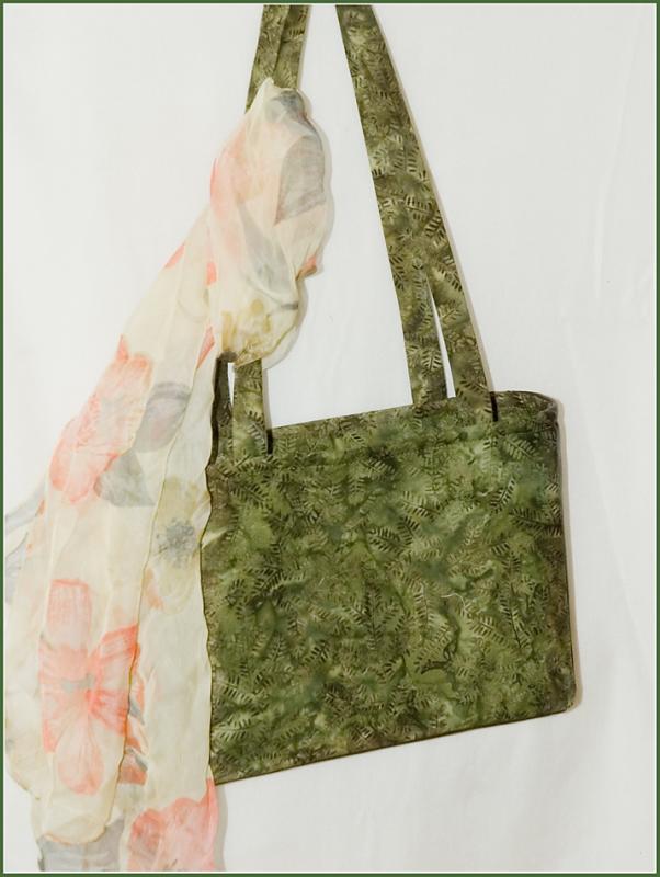 Elegantní kabelka ušitá z látky Roberta Kaufmana kolekce Batiks. Kabelka je vyztužena ronarem pro pěkný tvar. Bok a dno kabelky je ušito z hnědé ekokůže s atestem.