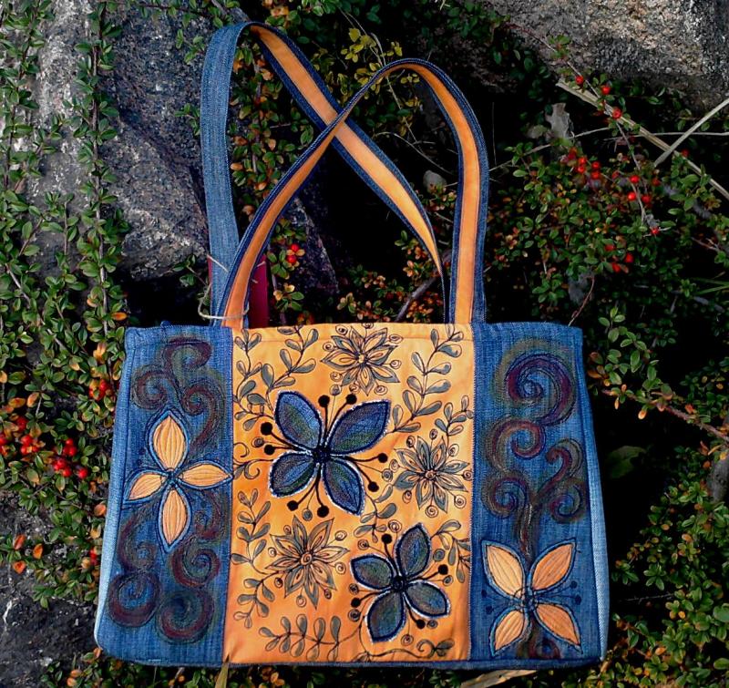 Kabelka je ušitá z recy-rifloviny, přední díl je dekorovaný aplikací z batikovaného bavlněného plátna, ruční i strojovou výšivkou a ruční malbou. Je vypodložená slabým molitanem, takže krásně drží tvar, je vypodšívkovaná a má jednu vnitřní kapsu, zapínání na suchý zip. Rozměry: 40 x 28 x 6 cm.