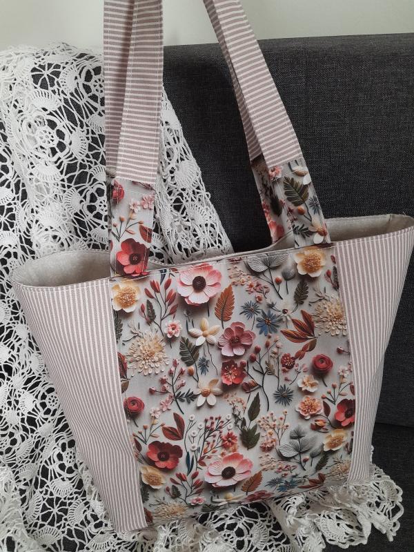 Nabízím kabelku, tašku šitou ze starorůžového proužku v kombinaci  s látkou s tiskem 3D květů. Zadní strana je proužkatá.   Kabelka je vypodšitá s vnitřní kapsou, má odšité rohy. Je vystužená, drží tak hezky tvar. Má zapínání na magnet.  Horní lem je dvakrát prošitý aby pěkně držela.   Do ruky i přes rameno.