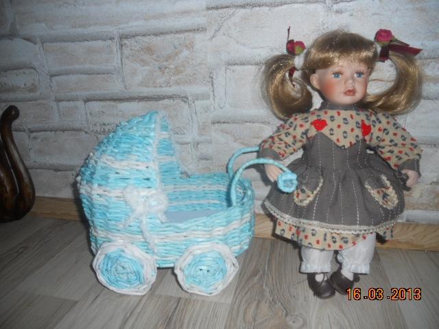 Předmětem nabídky je modrobílý z papíru pletený kočárek.