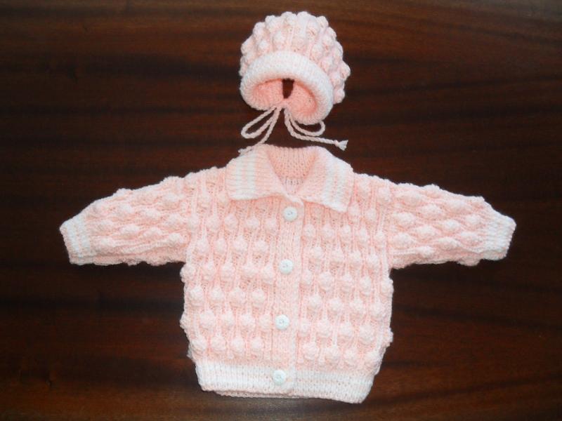 Ručně pletený svetýrek s čepičkou pro 0 – 3 měsíce. ze 100% akrylové příze vhodné pro miminka v meruňkové barvě s bílou nitkou. Vhodné do porodnice nebo na křtiny, i jako dárek pro novorozeňátko.