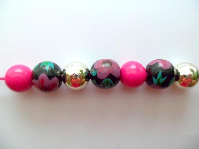 Náhrdelník je vyroben z velkých dřevěných korálků různých velikostí a barev,
