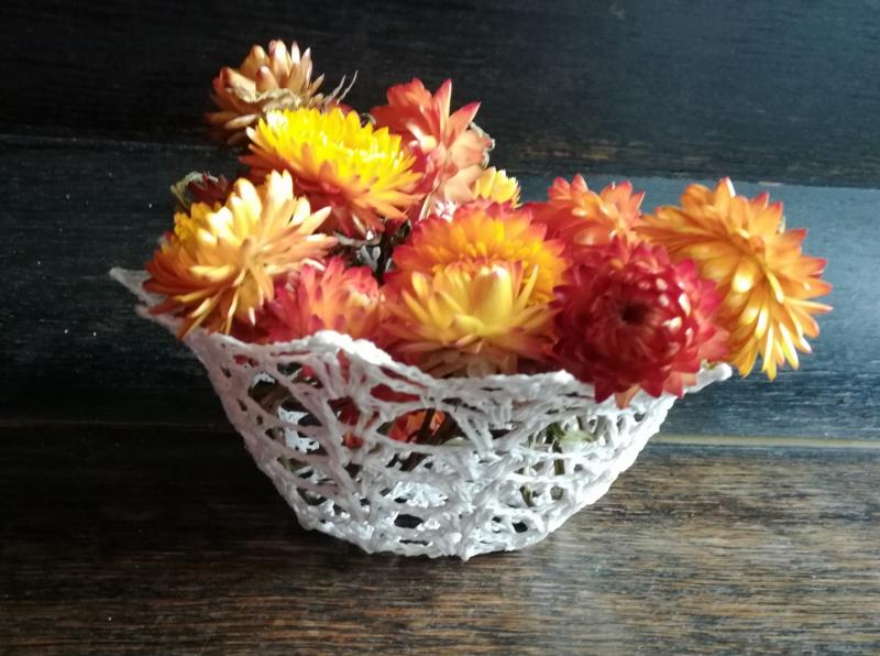 Košíček je uháčkovaný z tenké bavlněné příze zn Sněhurka a silně naškroben. Spodní průměr je cca 6cm, horní cca 17cm a výška cca 6cm