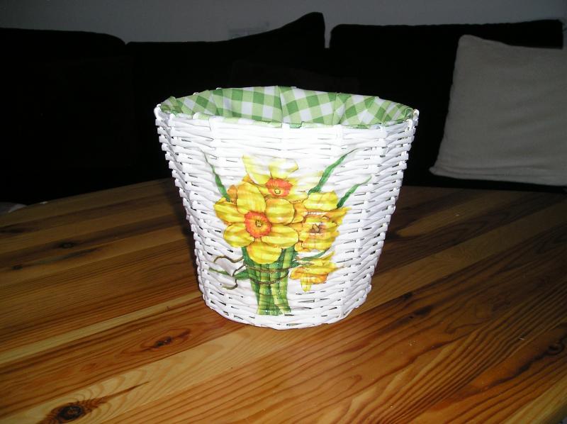 Papírový košík,zdobený jarními květy a látkou.
