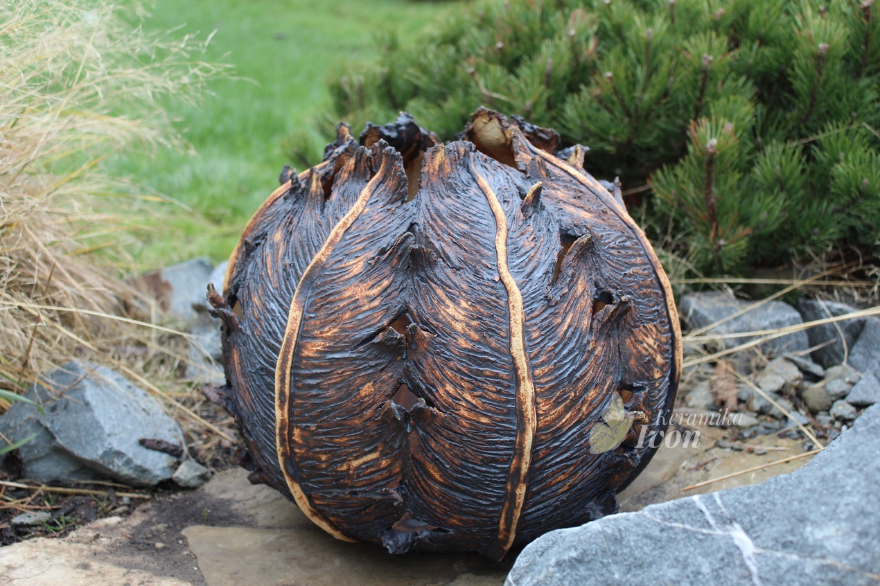 <p>Ručně modelovaná koule na svíci v listovém dekoru.</p>