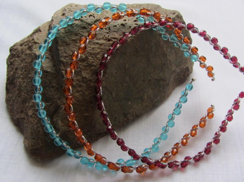 Krásná stříbrná čelenka ozdobená skleněnými korálky vínové barvy.