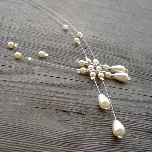 Náhrdelník z bižuterního lanka stříbrné barvy, s krémovými voskovanými kapkami na předních koncích, středový motiv je tvořený z dvou stříbrných tyček a voskovaných perliček.