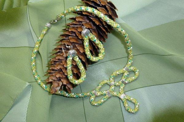 kumihimo souprava obsahující náhrdelník se zajímavým motivem na přední části a dlouhé náušnice