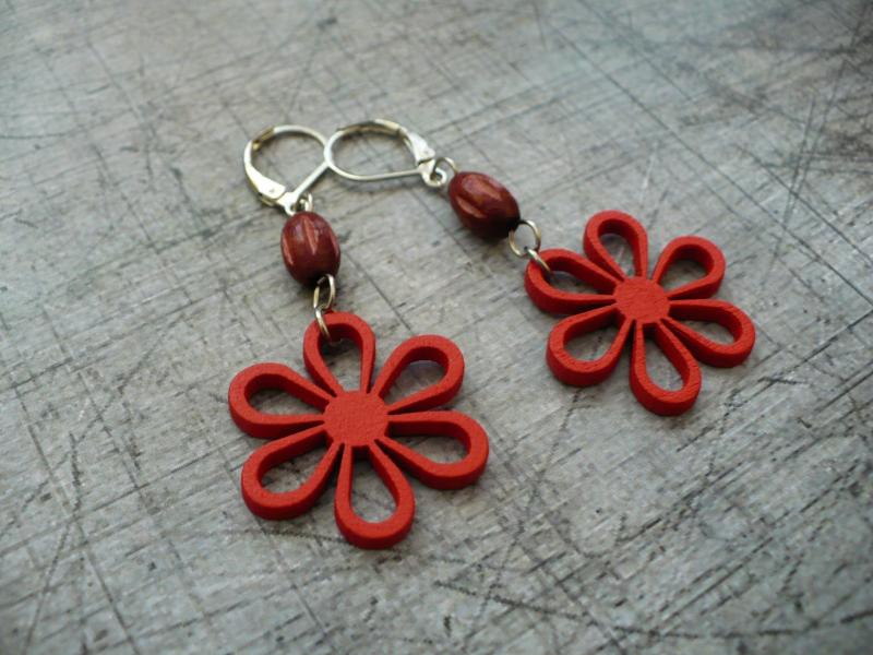 Ketlované naušnice jsou vyrobeny z lehkých dřevěných výseků ve tvaru kytičky a dřevěného korálku. Jsou velmi lehoučké. Komponenty platinové.