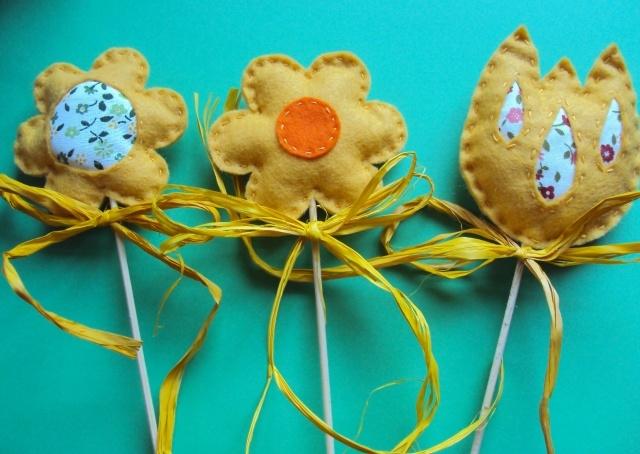 Set žlutých kytiček, ručně ušito z filcu, plněno dutým vláknem, upíchnuto na špejli. Každý květ je originál. K dostání různé barvy květů – červená, oranžová, růžová. Výška květu cca 10 cm + špejle.