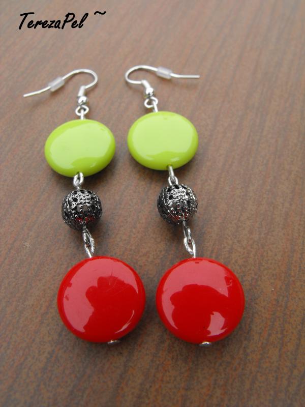 – vyrobené z plastových korálků červené a zelené barvy ve tvaru lentilek, zavěšené na afroháček