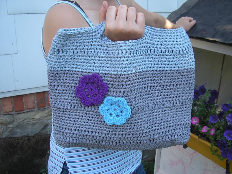 Kabelka je pevná a prostorná, aplikace je vyrobená z akrylové příze.