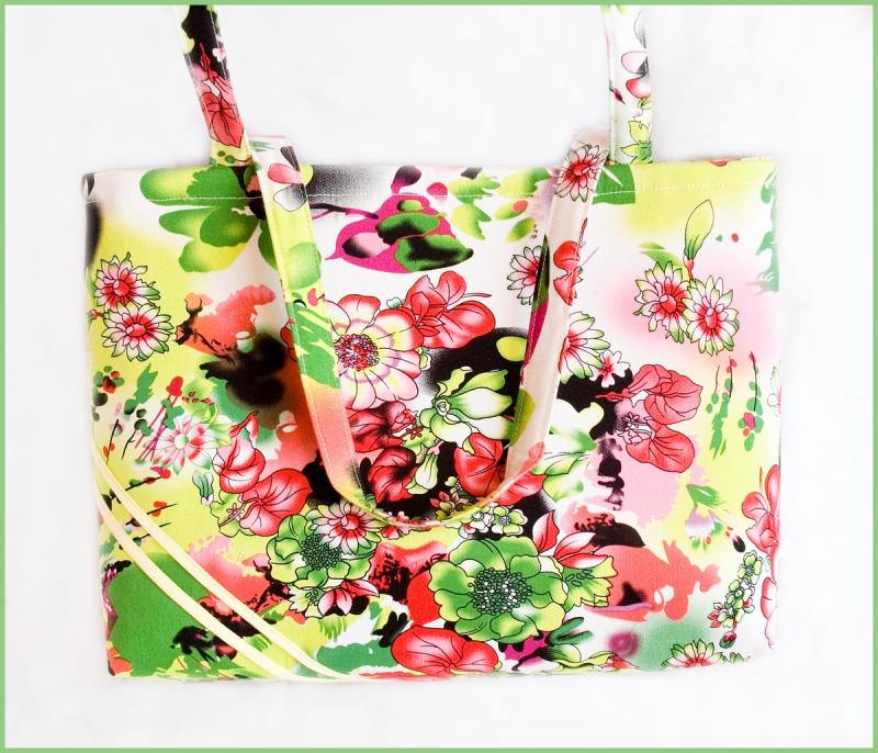 Elegantní kabelka s výrazným květinovým vzorem z bavlněné látky s příměsí elastanu. Šířka 34cm, výška 24, hloubka 11cm. Ucha jsou dlouhá 60cm pro pohodlné nošení přes rameno.