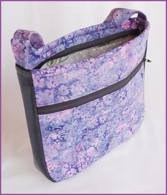 Elegantní a nápaná kabelka vytvořená z bavlněné dovozové látky z kolekce Robert Kaufman – batiks. Šířka 27cm výška 26cm, s pevnou výztuží pro pěkný tvar a z boku kombinovaná z umělou kůží. Podšívku má z kvalitní bavlněné béžové látky s puntíky a růžičkami, všitými kapsami na obou stranách a řemínkem s karabinkou na připevnění klíčů. Nastavitelný popruh umožňuje nosit kabelku i kros. Přední díl má kapsu zaviratelnou na zip.