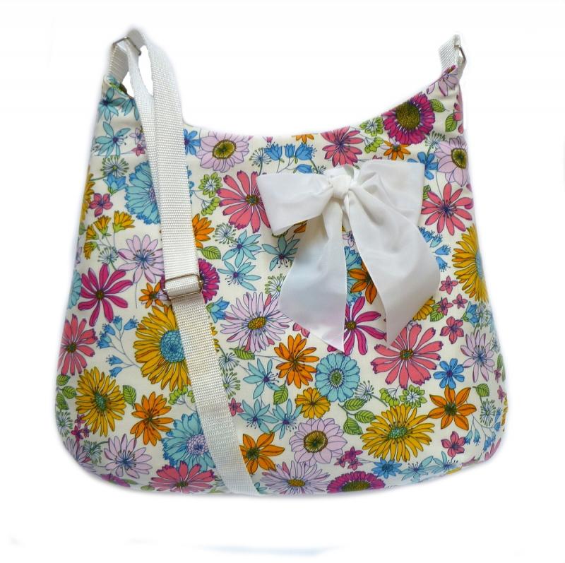 Kabelka z pevné bavlněné látky se vzorem květů na bílém podkladu. Krásně drží tvar je celá vyztužená krejčovským plátnem a ronolinem.